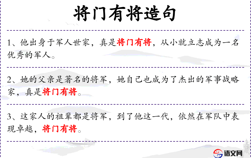 - 将门有将:成语,意指将军的家庭容易出将军,比喻家族中有才能的人辈出。