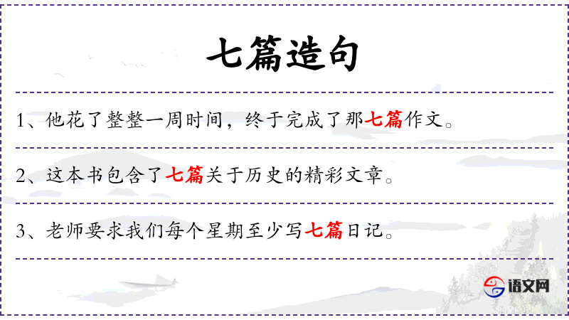 1. 【七篇】 - 七篇文章。特指《孟子》。该书七篇,故称。