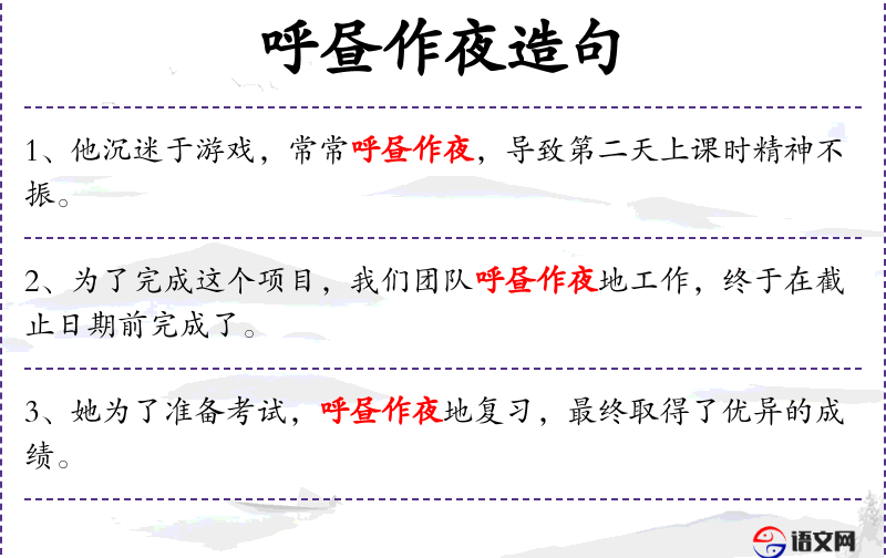 - 呼昼作夜:成语,形容不分昼夜地工作或学*。