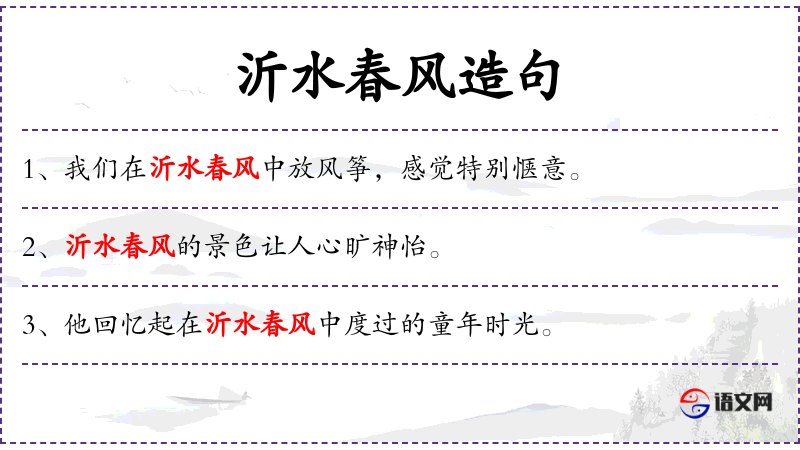 1. 【沂水春风】 - 沂水:河水名,在山东省曲阜县境内,孔子出生地。春风:春天和暖的风,比喻良好的熏陶和教育。来自沂水的春风。比喻深受孔学的教育与熏陶。