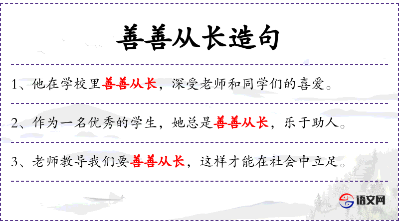 句子:“[老师教导我们要善善从长,这样才能在社会中立足。]”