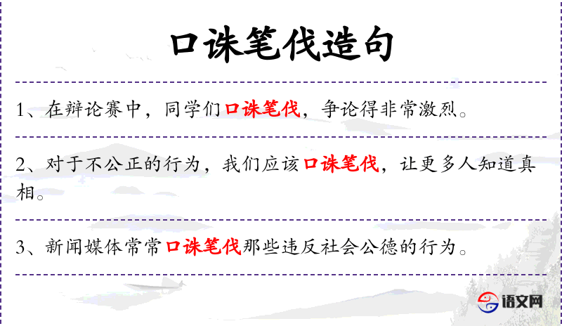 - 效果:通过使用“口诛笔伐”这一成语,增强了表达的力度和情感色彩,使读者或听众感受到强烈的批评和谴责。