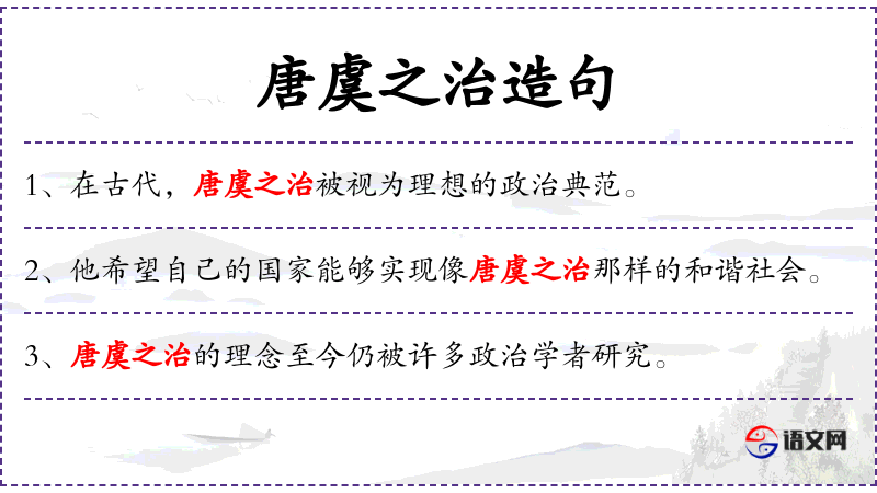 - 唐虞之治:指**古代传说中的尧(唐)和舜(虞)的治理时期,被认为是政治清明、社会和谐的典范。