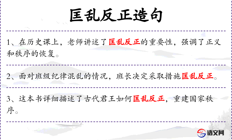 - 匡乱反正:成语,意为纠正错误,恢复秩序。