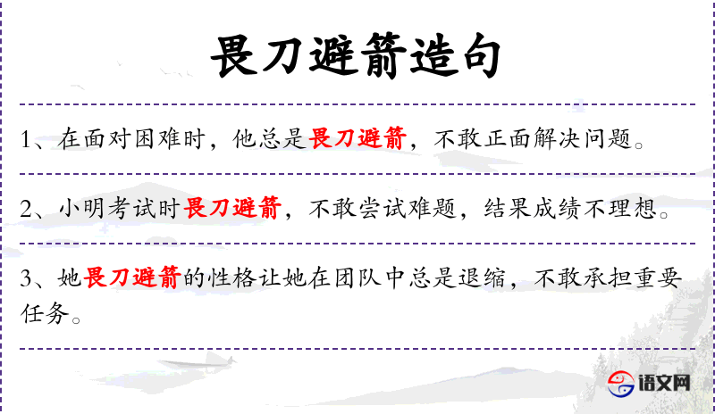 4. 【畏刀避箭】 畏:害怕,畏惧。比喻遇战事退缩不前。