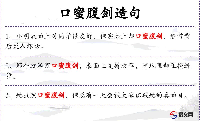 - 口蜜腹剑:这个成语源自**古代,形容人表面上和善,内心却阴险。