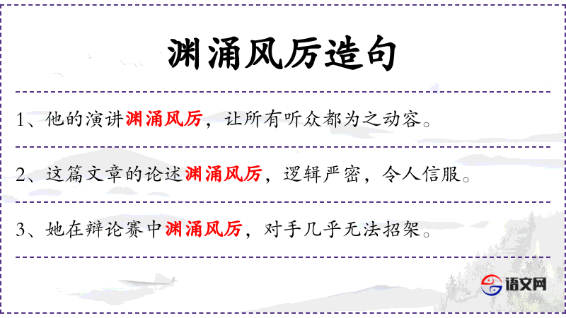 5. 【渊涌风厉】 - 如水之涌,如风之疾。比喻谈吐滔滔不绝。