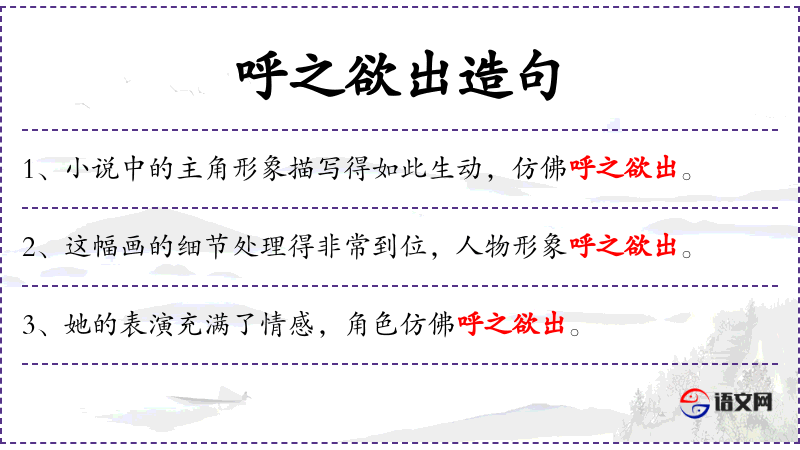 - 成语“呼之欲出”源自**古代文学,形容描写生动,形象跃然纸上。
