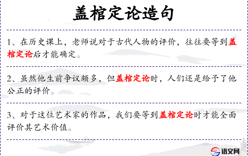 2. 【盖棺定论】 - 盖上棺材盖,才能下结论。指人死后对其一生作出评价。