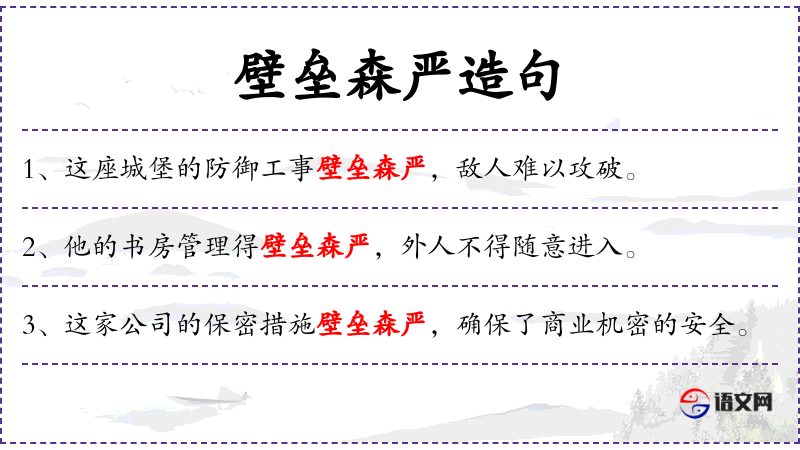 1. 【壁垒森严】 壁垒:古代军营四周的围墙;森严:整齐,严肃。原指军事戒备严密。现也用来比喻彼此界限划得很分明。