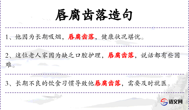 - 唇腐齿落:成语,形容口腔健康状况极差。