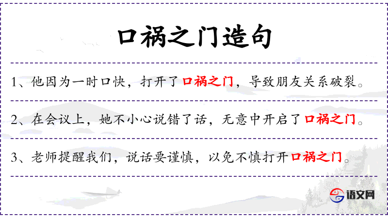 - 口祸之门:名词短语,比喻因说话不当而引起的麻烦或灾难。