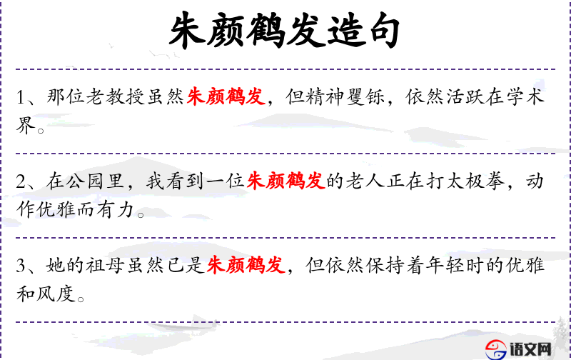 朱颜:红润的脸。红润的脸和像鹤羽毛一样白的头发。形容老年人精神焕发的样子。