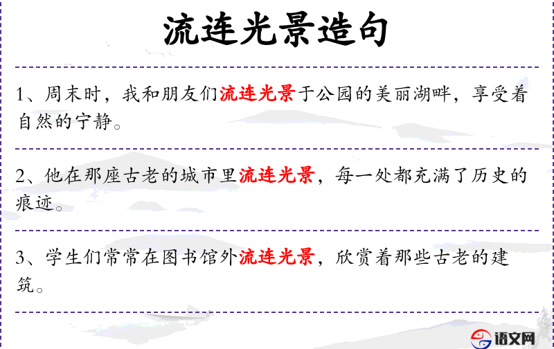 4. 【流连光景】 - 留恋风光景物。指因逗留某地而拖延时间。也指文艺作品的题材或辞句史局限于风花雪夜。