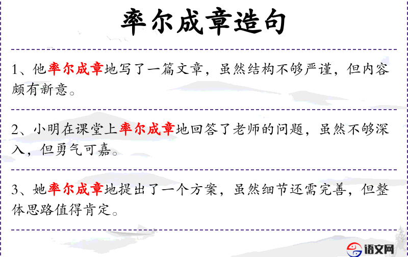 1. 【率尔成章】 - 率尔:不经思索,随意地。不加思索,下笔成文。形容写文章粗疏草率,不认真。