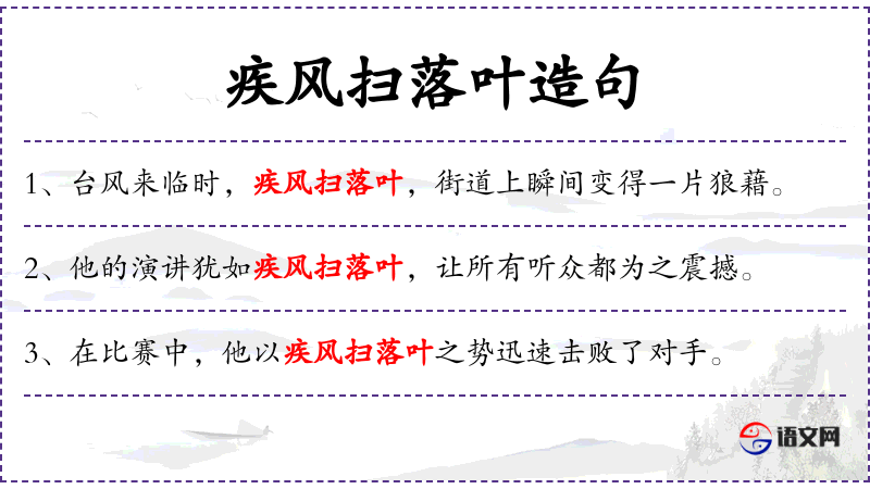3. 【疾风扫落叶】 - 疾:猛烈。比喻力量强大、行动迅速,象暴风扫除落叶一样。