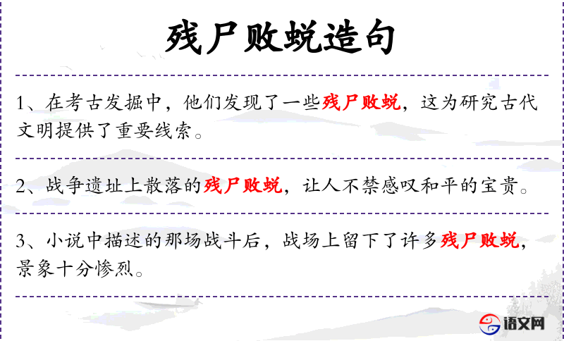 6. 【残尸败蜕】 残:破损的;败:败坏了的;蜕:昆虫脱的皮。残损的尸体,败坏了的躯壳。形容腐烂的骸骨。
