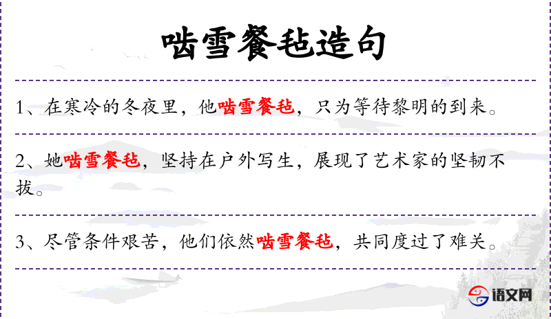 句子:“在寒冷的冬夜里,他啮雪餐毡,只为等待黎明的到来。”