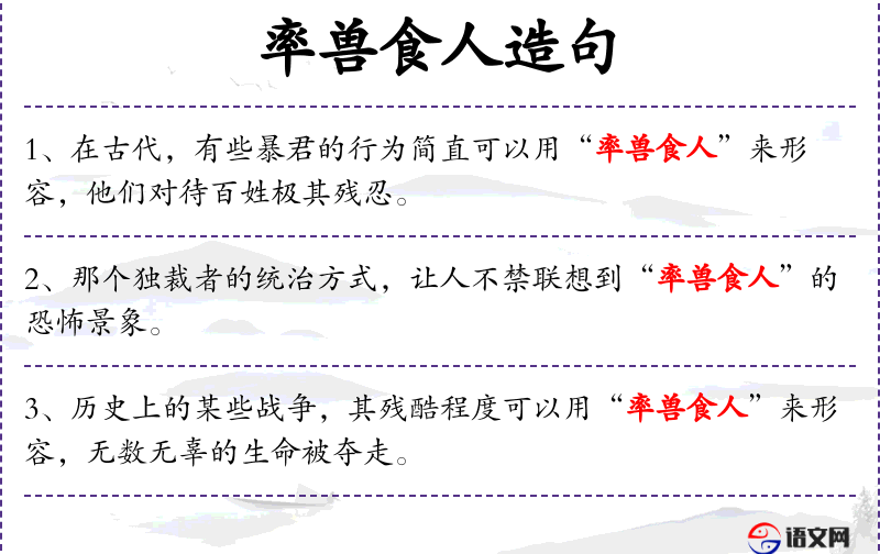 2. 【率兽食人】 - 率:带领。带着野兽来吃人。比喻统治者虐害人民。