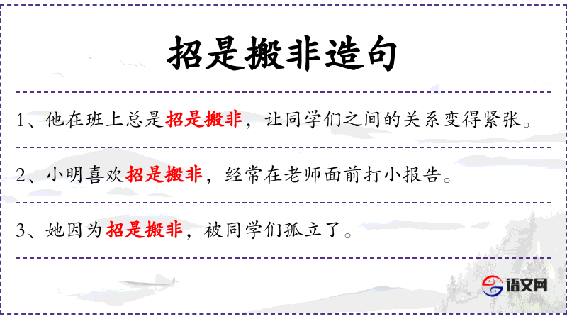- 招是搬非:这个词组意指挑拨离间,制造是非。