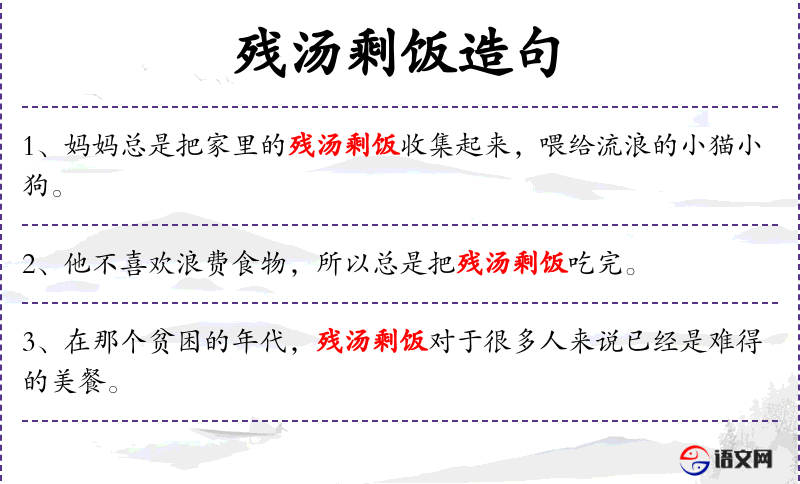 1. 【残汤剩饭】 - 残:剩下的。吃剩下的汤水饭食。