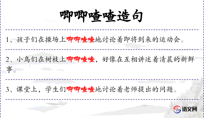 - 唧唧喳喳地:嘈杂地、喧闹地