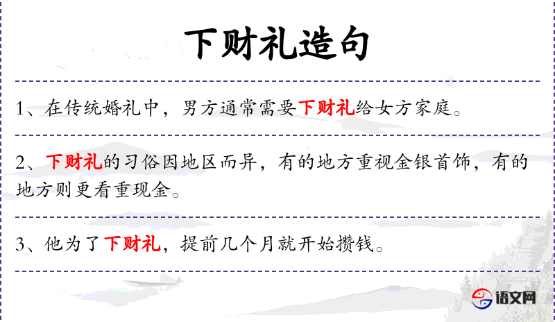 1. 【下财礼】 旧式聘婚,男方向女方赠送实物及钱财谓之下财礼。