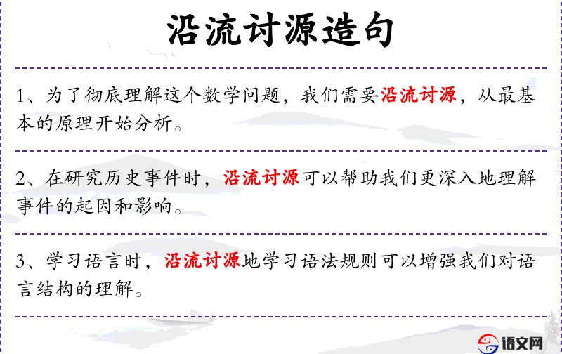 6. 【沿流讨源】 沿流:顺着水流;讨源:探索源头。循着水流寻找源头。原比喻作文时由次要的写到主要的,最后点出主题。后比喻探讨事物的本末。