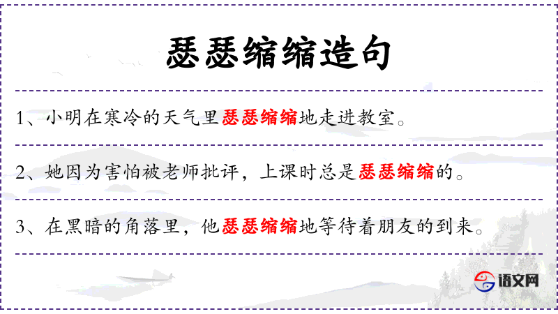 1. 【瑟瑟缩缩】 - 身体因寒冷、惊恐等而蜷缩、抖动。