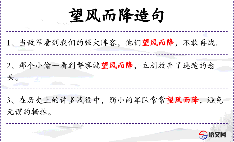 1. 【望风而降】 风:踪影。降:投降。看见敌人的影子便缴械投降。形容军队毫无士气。