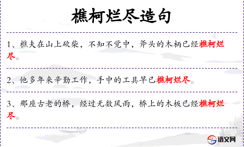 2. 【樵柯烂尽】 - 砍柴的斧子手柄已经烂掉。比喻时间的长久和世事的变迁。