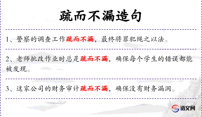 2. 【疏而不漏】 - 意思是天道公平,作恶就要受惩罚,它看起来似乎很不周密,但最终不会放过一个坏人。比喻作恶的人逃脱不了国法的惩处。