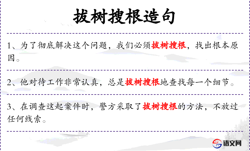“拔树搜根”是一个汉语成语,源自古代的农业社会,意味着要彻底解决问题,不留后患。这个成语体现了中华文化中对问题解决彻底性的重视。