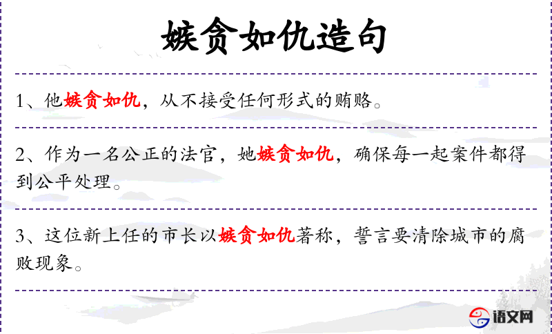 - 嫉贪如仇:形容对贪污腐败行为极其憎恨,如同对待仇敌一样。