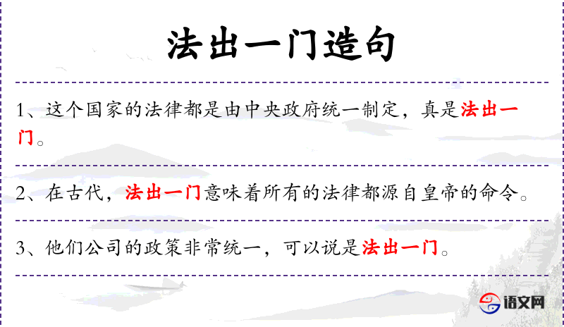 1. 【法出一门】 指法律统一,前后一致,不能随意变通。