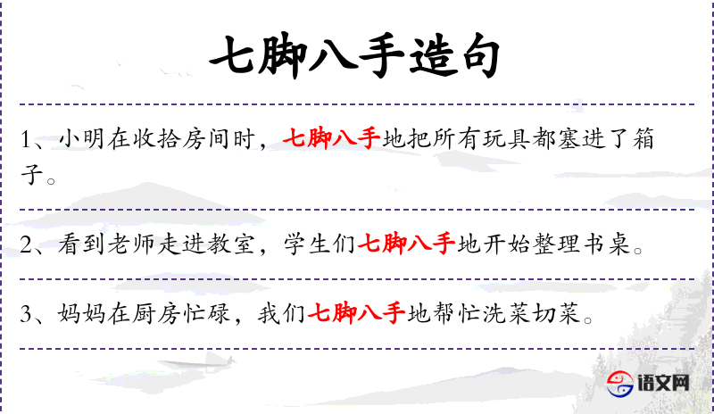 1. 【七脚八手】 - 形容动作忙乱,许多人一齐动手。亦作“七足八手”。