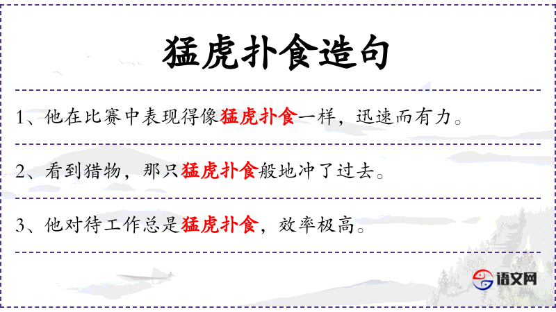 1. 【猛虎扑食】 - 老虎扑向食物。比喻动作猛烈而迅速。