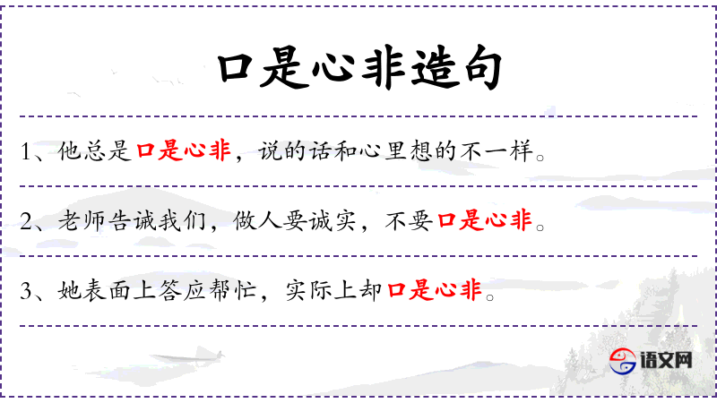- 成语:“口是心非”是一个常用的成语,用来描述表面一套、背后一套的行为。