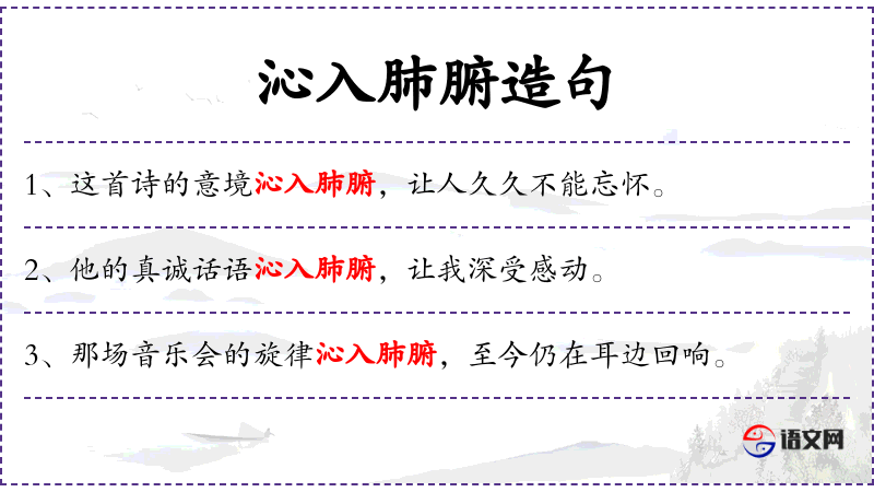3. 【沁入肺腑】 沁:渗入。原指芳香凉爽的空气或饮料使人感到舒适。也形容诗歌和文章优美动人,给人清新爽朗的感觉。