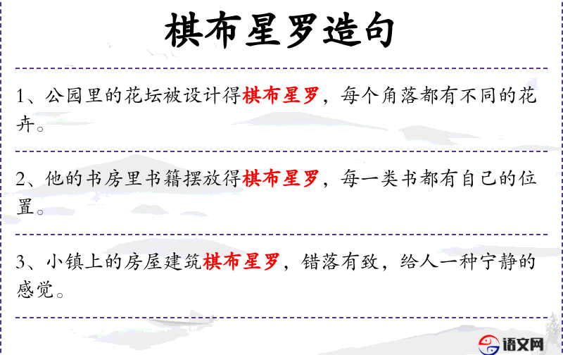 3. 【棋布星罗】 - 像棋子般分布,像星星般罗列。形容多而密集。