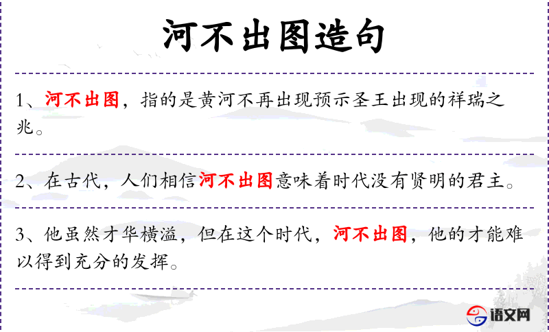 5. 【河不出图】 河:指黄河。黄河当中没有出现河图。古代相传每当圣明之世时,黄河便出现河图。因此黄河不出河图则不是圣明之世。指时当乱世。