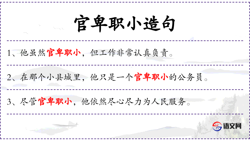 句子:“尽管官卑职小,他依然尽心尽力为人民服务。”