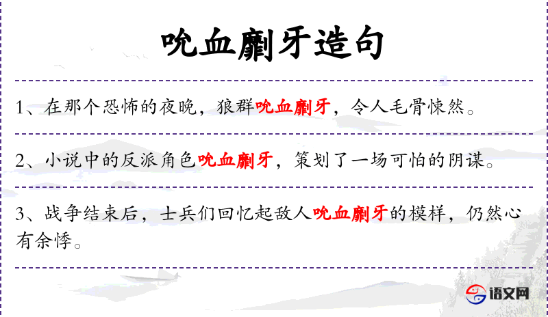 - 吮血劘牙:动词短语,形象地描述狼群的凶猛行为。