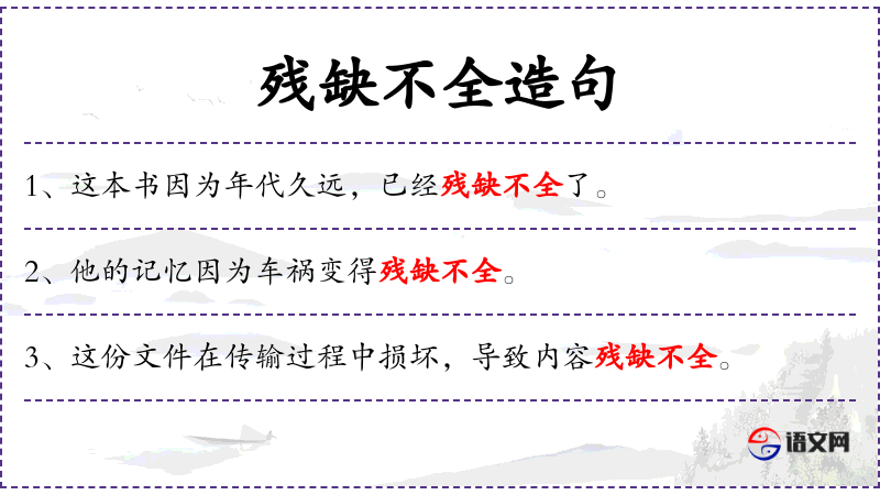 4. 【残缺不全】 - 残:残破;缺:缺少;全:完整。残破、缺少,很不完全。