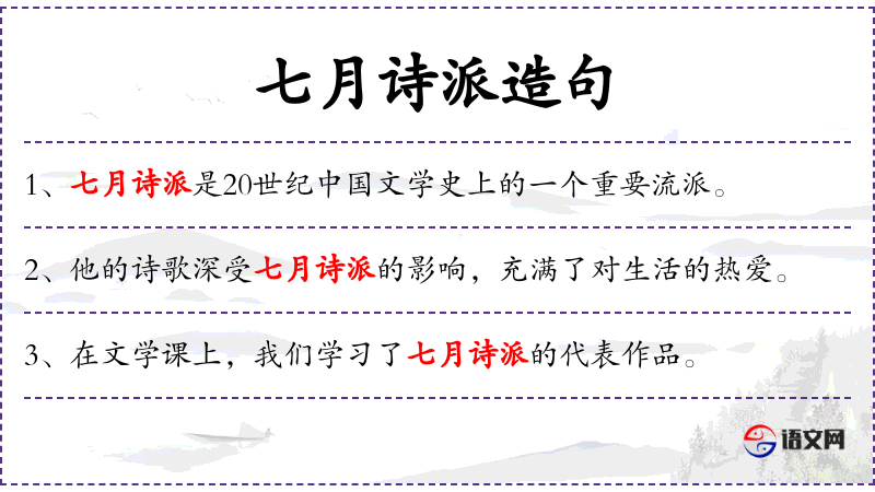 1. 【七月诗派】 文学流派。形成于抗日战争初期。其成员多在胡风主编的《七月》杂志上发表诗作,故名。作品多反映抗日战争时期的现实生活,诗体自由奔放,充满激情,在当时曾产生较大影响。