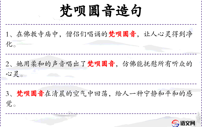 1. 【梵呗圆音】 - 梵:清净,常用来表示与佛教有关的事物;呗:佛教中的赞歌。诵佛教经典,唱佛教赞歌,讲解佛教教义之音。表示举行法会。