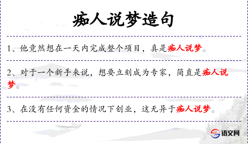 6. 【痴人说梦】 痴:傻。原指对痴人说梦话而痴人信以为真。比喻凭借荒唐的想象胡言乱语。
