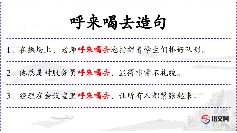- 呼来喝去:形容大声呼喊,指挥的样子。