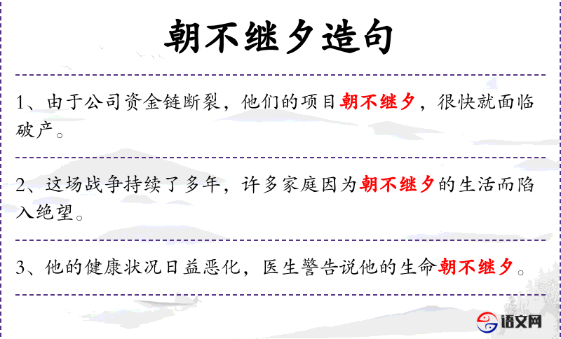 3. 【朝不继夕】 不晨不能顾到晚上。形容情况危急,难以预料。