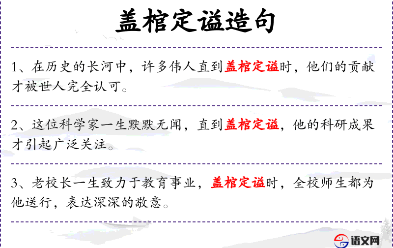8. 【盖棺定谥】 谥:谥号。中国帝制时代为死去的帝王或臣僚按其生前表现给予的称号。指人死后才能对他的功过做结论。